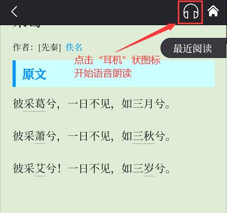 您可以在章节内容页单击(触屏点击)正文,弹出黑色菜单,点击右上角的“耳机”状图标,即可开始听书!