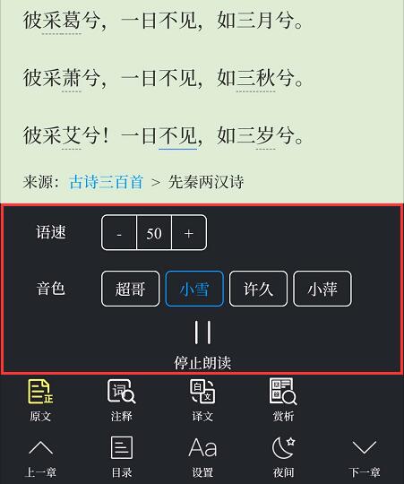 我们可以在“语音设置”中,可以调整“语速”(调整后,刷新到上/下一章生效);可以选择“音色”(更换音色后,将从当前屏幕顶部用更换后的音色重新朗读);有“停止朗读”/“开始朗读”按钮。